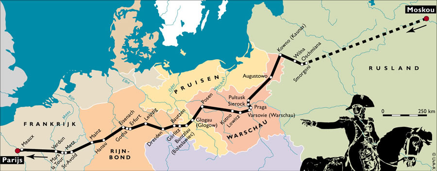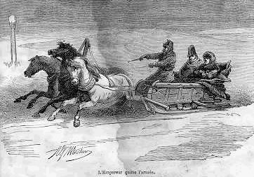Informé de la conspiration de Malet, Napoléon 1erdécide de quitter la Grande Armée le 5 Décembre 1812 pour rejoindre Paris au plus vite. Après avoir convoqué ses généraux de corps d’armée à Smorgoni (aujourd’hui au Bélarus) et laissé le commandement à Murat, il prend la route à 22H avec une petite suite de trois voitures. Maret, Ministre des Affaires Etrangères, l’attend à Medininkai au petit matin du 6 Décembre, l’Empereur atteint Vilnius à 10H15 mais ne s’y arrête pas, en repartant à 12H30. Il atteint Kaunas le 7 Décembre à 5H du matin, talonné par les cosaques, et dine à Marijampolė le 7 soir. C’est le 18 Décembre à 23H45 qu’il atteindra Paris, après deux semaines passées en tête à tête avec son Grand écuyer, le général Armand de Caulaincourt.
