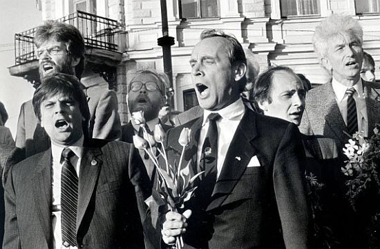 La « révolution chantante » allait, à partir de 1987, permettre aux trois Etats Baltes de retrouver leur indépendance. En Lettonie, le groupe « Helsinki 86 » (en référence aux accords d’Helsinki du 1er Août 1975 qui reconnaissaient le droit des peuples à l’autodétermination) organisa la première grande manifestation en 1987 pour commémorer les déportations massives du 14 Juin 1941. Le 18 Novembre 1988, c’est la célébration du 70e anniversaire de l’indépendance lettone, autour du monument de la Liberté. Après la chaîne humaine de 2 millions de Baltes entre Vilnius et Tallinn, via Riga, pour protester contre l’accord Molotov-Ribbentrop, le 23 Août 1989, ce furent 500 000 Lettons (soit près d’un quart de la population lettone !) qui se réunit le 18 Novembre 1989 sur les bords de la Daugava à Riga pour célébrer le Jour de l’Indépendance.