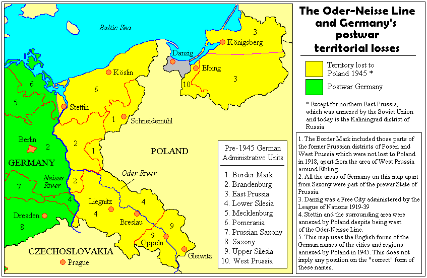 Déjà détruite par les bombardements anglo-américains d’Août 1944, Königsberg fut conquise du 6 au 9 Avril 1945 par l’armée rouge du Maréchal Alexandre Vassilevski, dans des combats très sauvages. Le commandement soviétique concéda officiellement trois journées de pillage (avec les habituelles exactions qui s’ensuivirent) du 10 au 12 Avril 1945. La Conférence de Postdam (17 Juillet – 2 Août 1945), réunissant Churchill, Truman et Staline, fixa le sort des nations ennemies (Allemagne, Italie, Japon). L’Allemagne et l’Autriche étaient de nouveau séparées, et les deux territoires divisés en quatre zones d’occupation. L’Allemagne subissait un déplacement vers l’ouest de sa frontière orientale, perdant la Prusse-Orientale au profit de la Pologne (partie sud) et de l’URSS (partie nord, avec Königsberg). Les populations ethniquement allemandes étaient expulsées de l’Europe de l’est ; au total plus de 11 millions d’Allemands seront expulsés, 2 millions mourront et 2,5 millions resteront dans les anciens territoires de peuplement allemand.