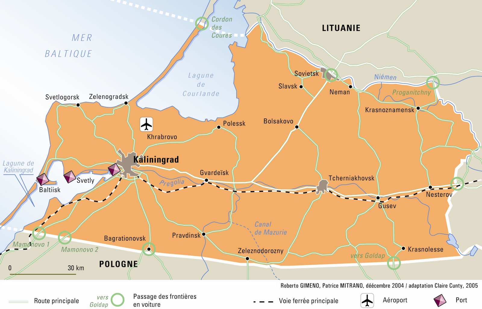 Port libre de glace, Baltiysk (avant-port de Kaliningrad) était une base navale essentielle pour les soviétiques et le quartier général de la flotte de la Baltique y fut transféré. La région était rigoureusement fermée aux étrangers. Avec l’éclatement de l’URSS en 1991, l’Oblast de Kaliningrad est devenu une exclave de la Fédération de Russie, entre la Pologne et la Lituanie. Qui plus est, avec l’entrée de leurs voisins dans l’Union Européenne en 2004, les habitants de Kaliningrad ont eu besoin d’un visa pour sortit de leur « île » par voie terrestre. D’âpres négociations entre la Russie et l’UE ont abouti à l’instauration d’un Facilitated Transit Document (FTD). Voir à ce propos la déclaration de l’Ambassadeur honoraire Ričardas Bačkis : http://www.diploweb.com/forum/backis06053.htm