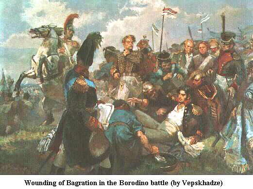 A la bataille de Borodino / la Moskova, c’est lui reçoit le principal de l’attaque française. Alors que le Général Auguste de Caulaincourt emporte la décision en enlevant la grande redoute, assaut au cours duquel il est tué, le Prince Bagration est grièvement blessé en fin de journée. On dit que, descendu de son cheval, il continua à donner des ordres avant de perdre connaissance. Le centre et l’aile gauche russe furent sérieusement mis à mal, mais Napoléon refusa toutefois d’engager la Garde Impériale pour peut-être détruire l’armée russe, la réservant pour une hypothétique autre bataille devant Moscou (distante de 125 km).