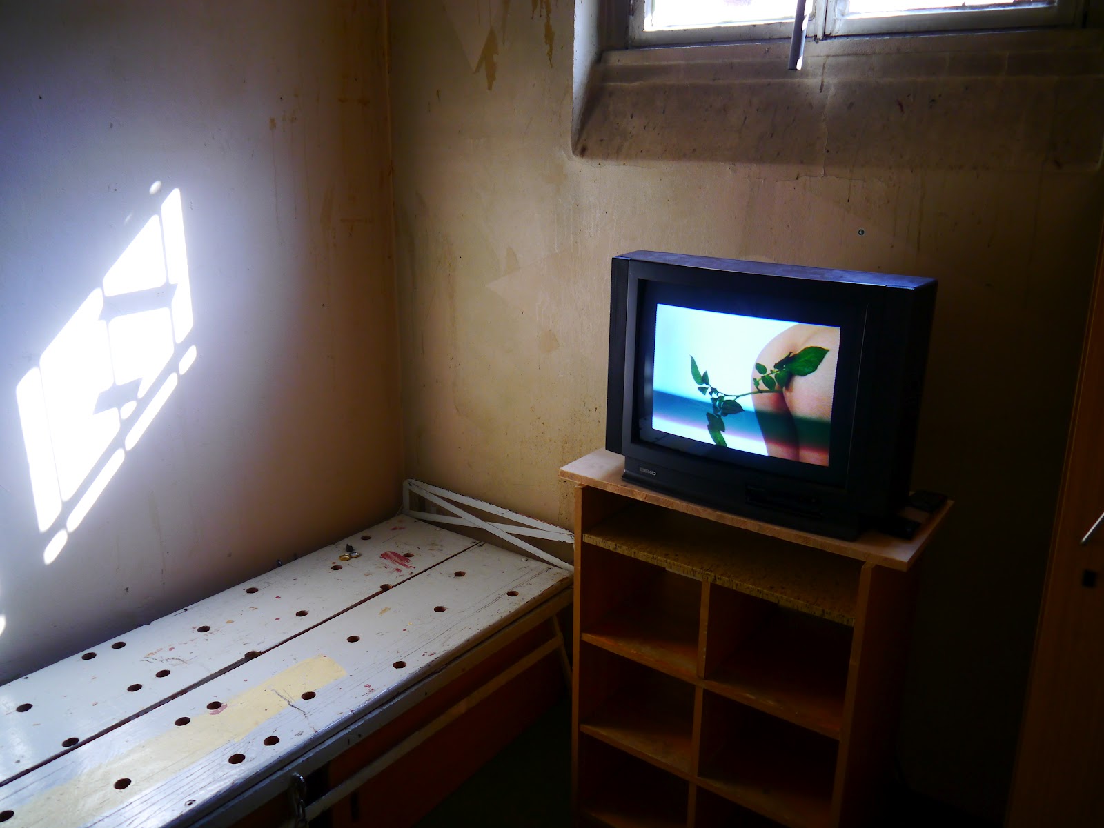 Une oeuvre vidéo dans une cellule de l’ancienne prison de la Schönstedtstraße. Oui, c’est bien ce que vous voyez: un plant de tomate qui pousse dans un cul. Il n’y avait aucune explication.