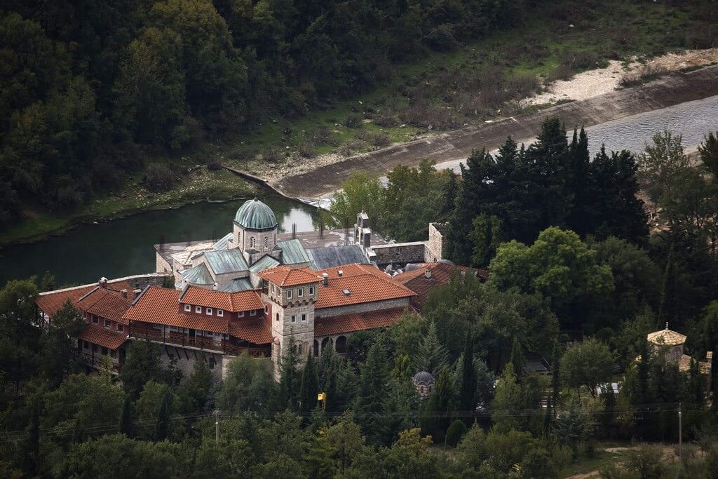 Tout ici paraît si calme. En cette après-midi de septembre, le parking est désert. Nous n’avons pas croisé une âme depuis que nous nous sommes engagés dans l’enceinte. Il faut tendre l’oreille avec attention pour deviner le bruissement de la Trebišnjica que surplombe le monastère. Nous longions la rivière depuis Trebinje, qui lui a inspiré son nom, et elle nous rappelle ainsi à son souvenir. Son cours presque indolent renforce cette impression de sérénité que rien ne saurait perturber si ce n’est le gazouillis des oiseaux.