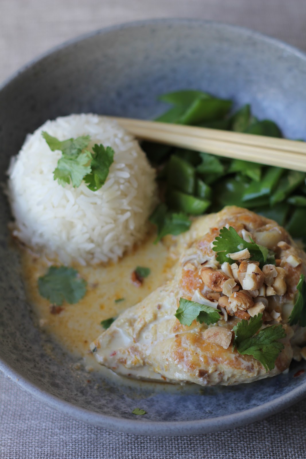 Aujourd’hui un peu de soleil et de chaleur dans ma cuisine avec un bon plat bien parfumé : un curry de poulet aux noix de cajou au lait de coco . Je vous propose de le cuisiner en toute simplicité c’est à dire d’utiliser en base une bonne pâte de curry que vous pouvez trouver dans les rayons asiatiques de vos supermarchés ….