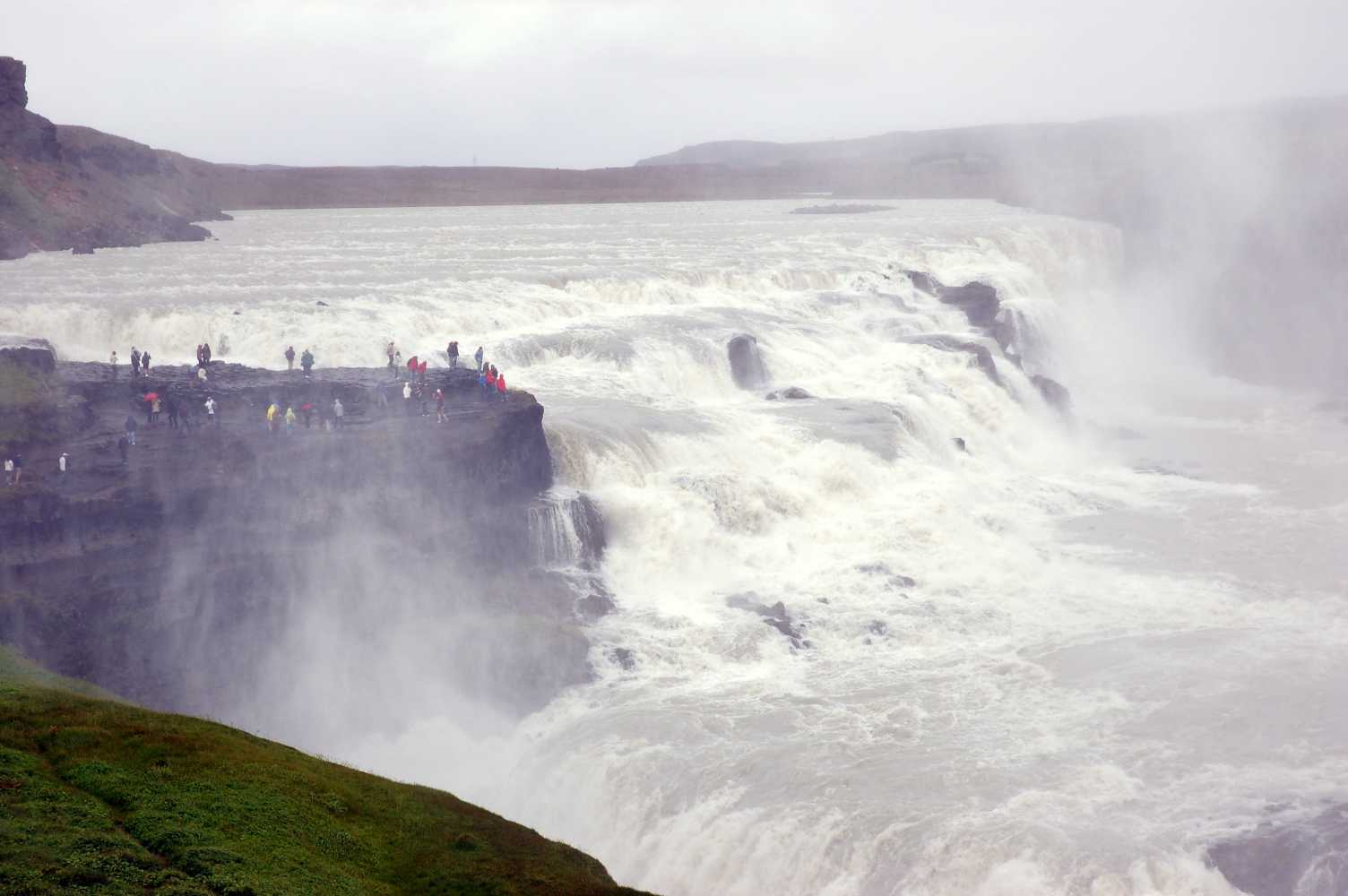 Gullfoss, un peu plus à l’est, signifie « chutes d’or » à cause de l’arc-en-ciel qui enjambe le site les jours de beau temps. Mesurant 2.5 km de large et 32 m de hauteur, et délivrant environ 250 m2 d’eau par seconde, cette chute d’eau monumentale, plongeant dans un grand canyon, est l’une des plus spectaculaire et des plus puissante chutes d’eau au monde (notamment en été avec la fonte des glaces).