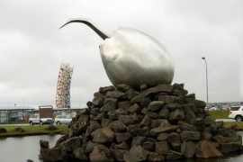 Le parking de l’aéroport de Keflavik nous offre l’ornement de sculptures modernes dont un œuf d’acier poli d’où sort un bec de Concorde. L’oiseau est si gros qu’il a, adulte, au moins l’envergure de l’avion. Le bus est conduit par une chauffeuse blonde à carrure de catcheuse qui doit caresser la bouteille en fin de semaine. C’est, dit-on, la tradition ici que la cuite du vendredi. Pas étonnant à ce que l’alcool soit taxé à 1000% et vendu exclusivement en magasins d’État !
