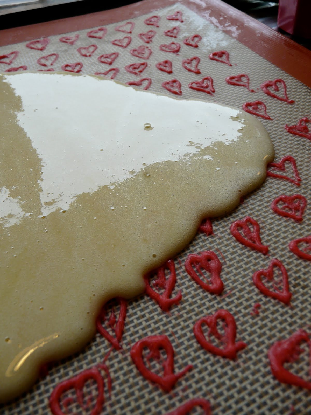 Préparez le biscuit en fouettant les oeufs avec le sucre jusqu’à ce que le mélange blanchisse (super important de bien les fouetter pour obtenir un gâteau bien moelleux) Ajoutez la farine et mélangez.Versez la pâte sur la plaque congelée et travaillant assez rapidement , recouvrez totalement tous les motifs. Cuisez 10 mn.