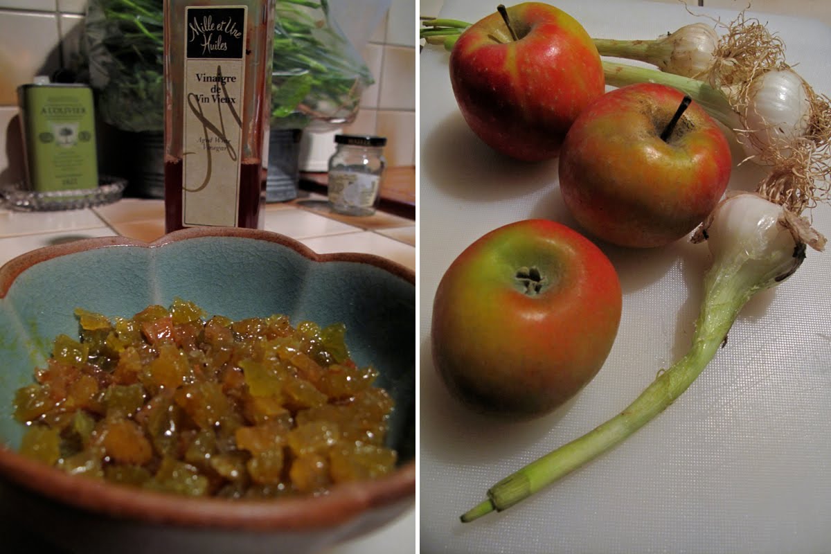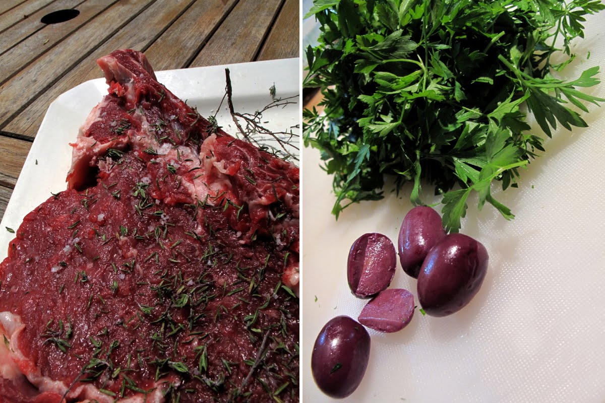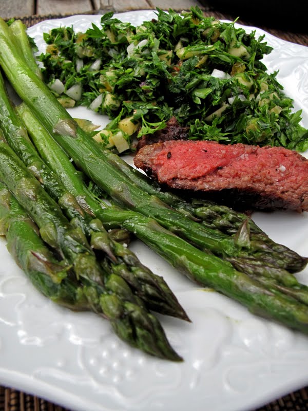Un taboulé dont la recette est quelque peu revisitée. Ce taboulé est persillé comme dans la cuisine libanaise… Ce n’est pas la saison des tomates qui viennent juste d’être plantées, en revanche le persil pousse à foison, et les envies de taboulé réapparaissent. J’ai donc remplacé les tomates par des pommes, et agrémenté le tout de zestes de citron, d’olives violettes et de raisins au vinaigre de vin. Très frais, parfumé, délicieusement surprenant. Nous l’avons mangé avec une belle côte de bœuf cuite au barbecue, et des asperges vertes à peine revenues dans du beurre.