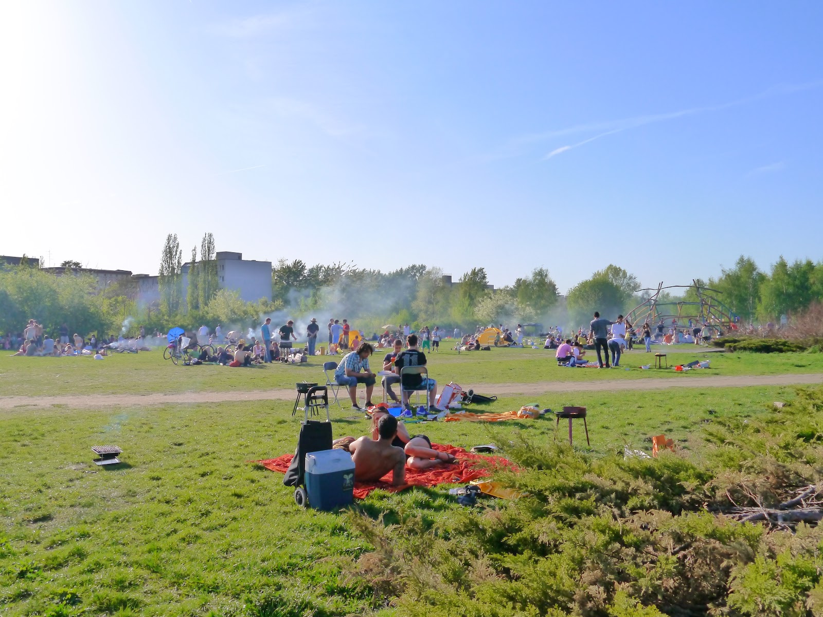 29 avril – Au Görlitzer Park de Kreuzberg, la température reste élevée. Étrangement, les barbecues brillent par leur absence. En revanche, on compte, à vue de nez, au moins deux vélos par par personne sur la pelouse rabougrie qui tapisse tant bien que mal la dépression centrale.