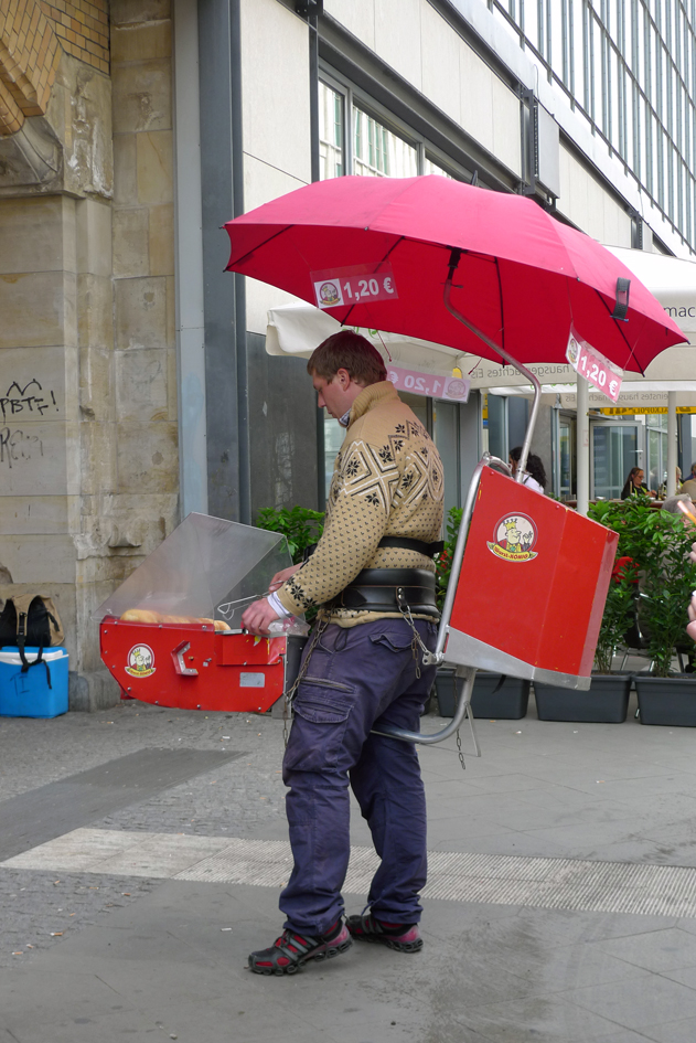 Et les vendeurs de saucisse, soucieux de ne rater aucun client potentiel, ont imaginé l’Imbiss portatif, en allemand on les appelle « les Grillwalker ». J’ai entendu dire que cela évitait de payer certaines taxes car ce n’est pas un stand, mais je pense que c’est aussi parce que ces vendeurs se placent dans des endroits stratégiques comme les sorties de métro ou les lieux de grand passage. On les voit de loin grâce à leur parapluie/parasol jaune ou rouge le plus souvent fixé sur leur dos. Le climat est rude à Berlin ! Ce petit boulot est pour les jeunes costauds mais j’ai vu un vendeur plus âgé en fauteuil roulant, ça marche aussi. C’est ce que j’appellerai tout de même le « Wurst-Lumpenproletariat » : Toute la journée debout, à essayer de gagner quelques euros, dont beaucoup vont dans la poche du patron qui les dépose et les reprend en camionnette chaque jour.